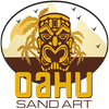 Logo featuring a stylized tribal tiki face with palm trees and birds in the background, and text that reads 'Oahu Sand Art'.